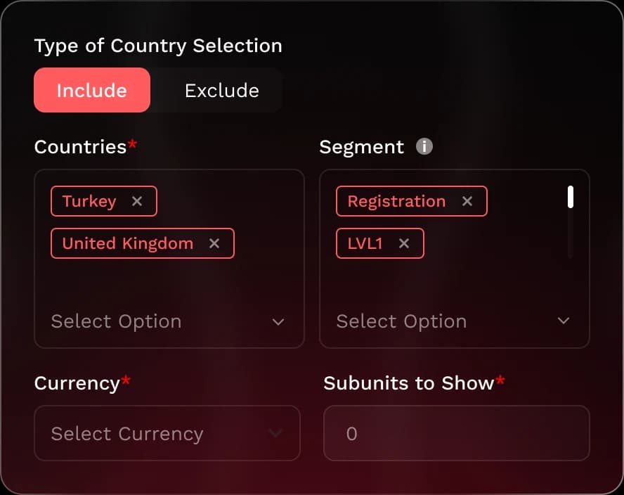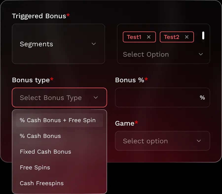 Flexible visual constructor of bonus logic: free spins, monetary mechanics, combined scenarios and conditions with full customization.